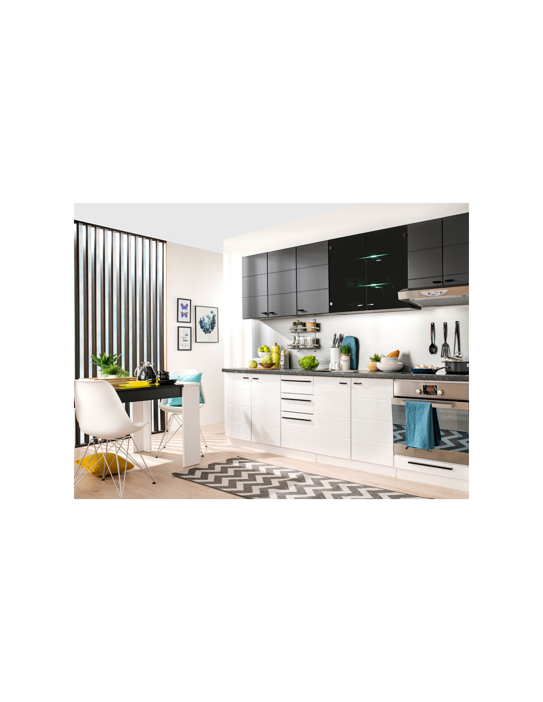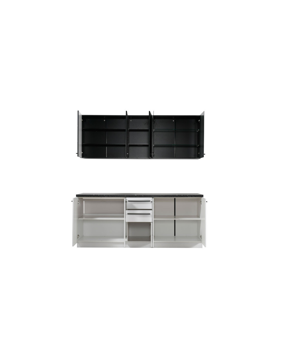 Kuhinja CLAUDIA 200, u kombinaciji neprozirno bijele i crne boje, s bijelom 3D MDF lak folijom na frontama donjih dijelova, te crnom 3D MDF mat folijom na frontama visećih dijelova, dizajnirana je kako bi zadovoljila funkcionalne i estetske zahtjeve u opremanju interijera kuhinje. Jednokrilni i dvokrilni viseći elementi, kao i donji dvokrilni elementi s funkcionalnim ladicama, pružaju dovoljno prostora za odlaganje posuđa, a poseban dodir kuhinji CLAUDIA 200 daje crno staklo kroz koje se vidi LED rasvjeta, kojom možete osvježiti kuhinju. Prilikom odabira ugradbenog sudopera za ovaj model kuhinje, potrebno je odabrati radnu ploču debljine 28 mm, kako bi sudoper i radna ploča bili u ravnini.