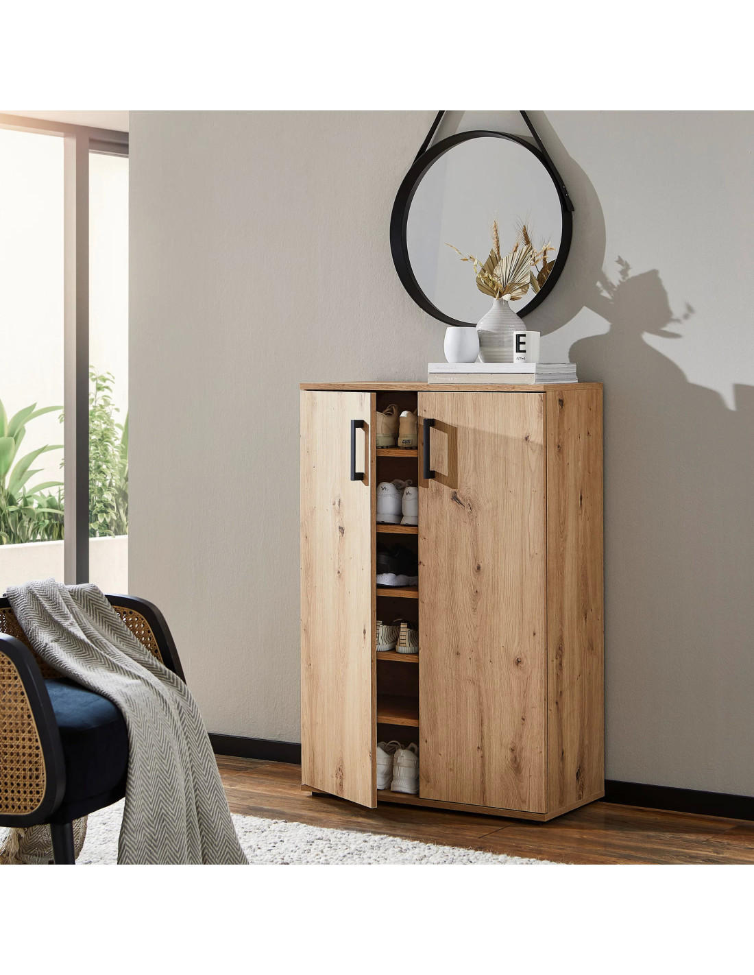 Neka Vas veličina hodnika ili predsoblja ne ograničava kod odabira namještaja koji će istaknuti Vaš stil, ali će se istovremeno i savršeno uklopiti u prostor. Kod dizajna predsoblja bitnu ulogu ima organizacija i urednost koju možete postići pomoću ovog višenamjenskog ormara "Alex". Dizajn u boji hrasta moći ćete uklopiti sa drugim namještajem i stilom u Vašem domu. Cjelokupnom dizajnu pridonose i zaobljene ručke u crnoj boji te četvrtaste crne noge, visine cca 1,5 cm koje osiguravaju stabilnost. Osim dizajna kod odabira namještaja važna je i praktičnost. Ovaj ormar u kojem možete organizirati Vašu obuću sadrži 5 polica, debljine materijala cca 16 mm i maksimalne opteretivosti po polici do cca 6 kg. Priuštite si kvalitetu i sjajan dizajn uz ovaj višenamjenski ormar.