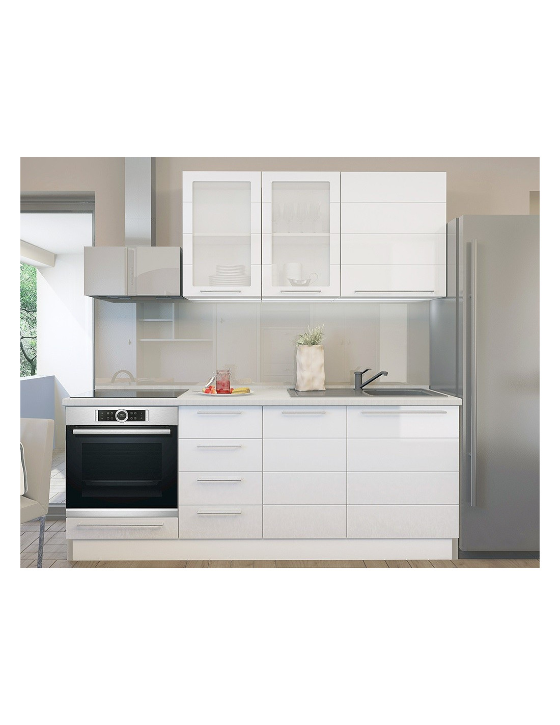 Kuhinja Highline sa frontovima od medijapana u Onyx sivoj boji u visokom sjaju. Frontovi u atraktivnim bojama daju kuhinji jednostavan i moderan izgled. Stakleni frontovi su izrađeni od kaljenog stakla. Duboke ladice omogućuju bolju organizaciju posuđa raznih veličina.