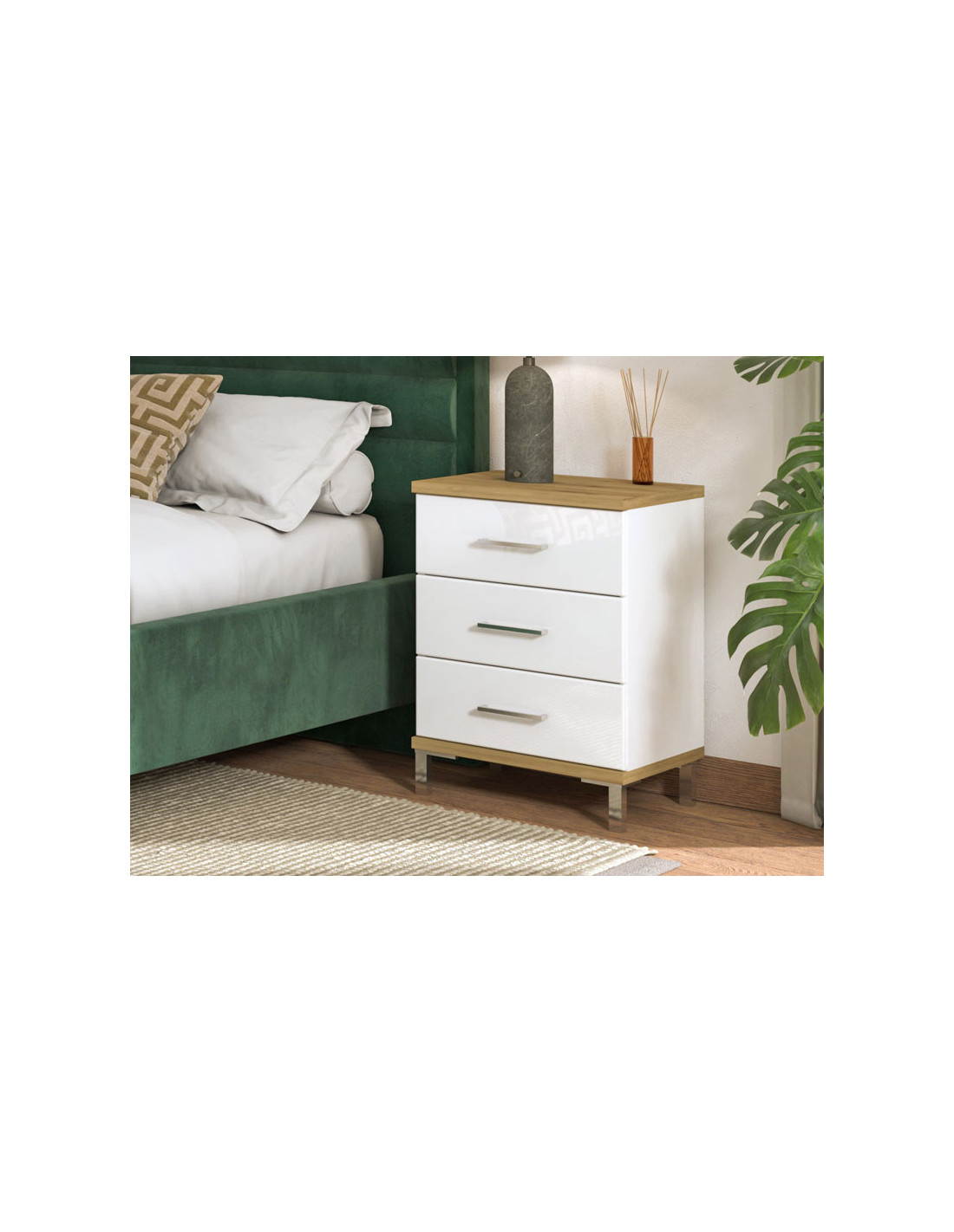Noćni ormarić MONDEGO NO3F dizajniran je kao kombinacija toplog dekora hrasta u umjetničkom stilu, u kombinaciji s tamnobijelim dekorom i bijelom lak folijom. Svojim blistavim izgledom unosi eleganciju u interijer. Ima tri ladice za pohranu.