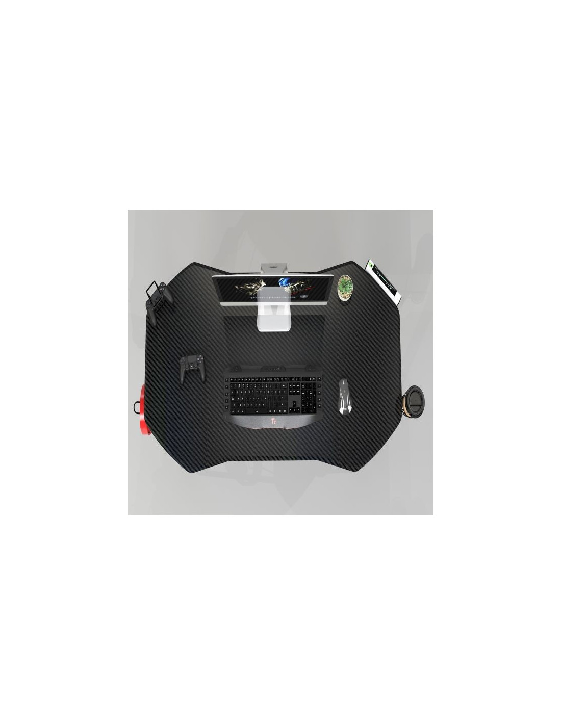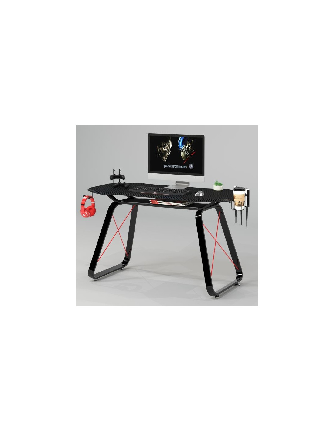 Radni stol koji će vas impresionirati svojim modernim izgledom. Ploča stola i polica izrađene su od MDF-a, presvučene PVC-om u crnom laminatu od karbonskih vlakana. Površina je crna s 3D teksturom. Metalne noge su u obliku slova i premazane crnom bojom u prahu. Stol nije samo moderan, već je i izuzetno praktičan. O tome se brinu dodaci poput držača za slušalice i držača za vaše omiljeno piće.