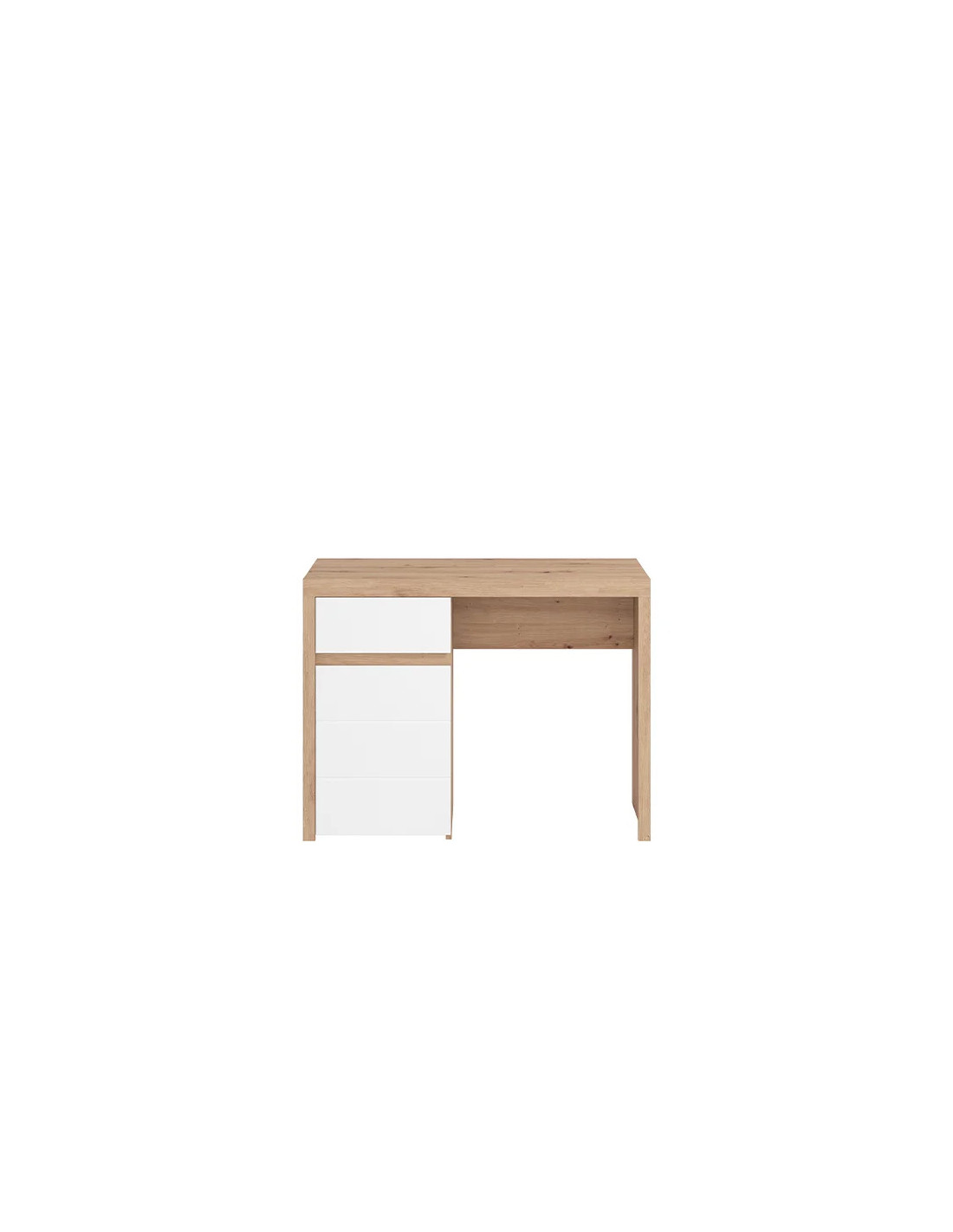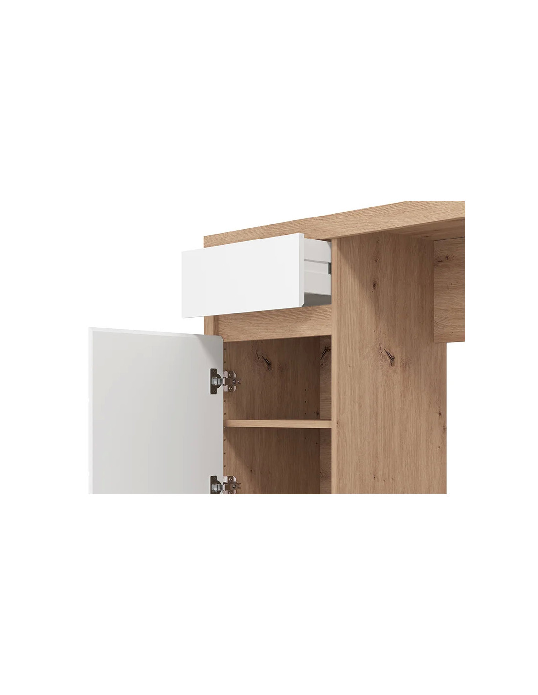 PC stol DIOFANT 1F1V LP, u kombinaciji artisan hrasta, bijele i artisan hrast folije, karakterizira moderan i elegantan dizajn s frontama bez ručki. Korisni prostor sastoji se od jedne zatvorene pregrade i jedne ladice, koje omogućuju pregledno i praktično skladištenje. Zahvaljujući funkcionalnoj organizaciji i estetski usklađenim dekorima, računalni stol DIOFANT 1F1V LP neizostavan je element za uređenje radnog prostora.