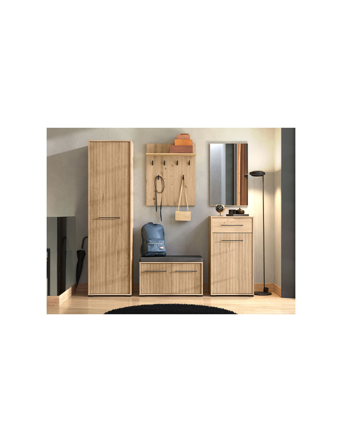 Element hodnika LANDES P1 OG, u kombinaciji hrasta artisan i hrasta artisan s prugama, ima praktičan iskoristivi prostor koji se sastoji od dvije police za odlaganje obuće i podesive šipke za odjeću.