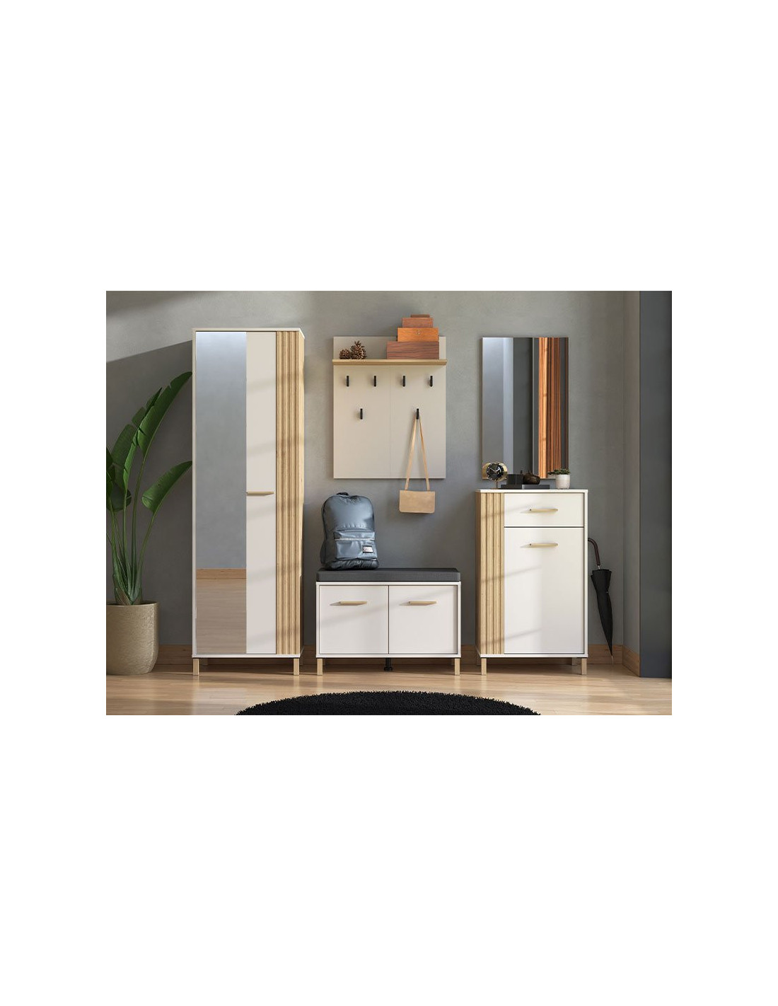 Element za predsoblje BELFORT P1 OG, u kombinaciji dekora hrasta artisan, dekora kašmir i folije hrasta artisan, ima praktičan iskoristivi prostor koji se sastoji od tri police za odlaganje obuće i police postavljene iznad podesive šipke za odjeću, a obogaćen je i ogledalom koje doprinosi njegovoj uporabnoj vrijednosti. Dio je istoimene kolekcije koja donosi suvremeni stil u vaš dom.