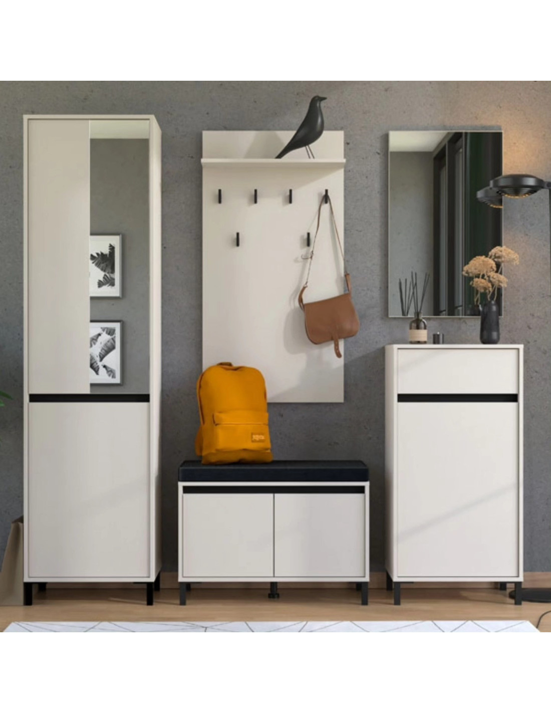 Element predsoblja ARRAN 1K1F, u kašmir dekoru i detaljima izrađenim od crne mat folije, sadrži praktičan zatvoreni dio za odlaganje obuće koji se sastoji od krila sa policama, kao i jednu ladicu.
