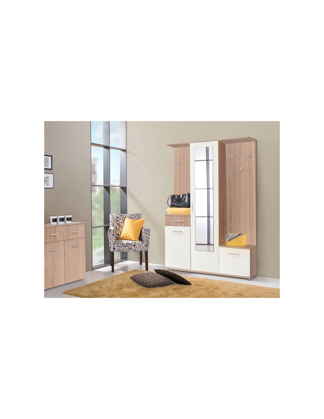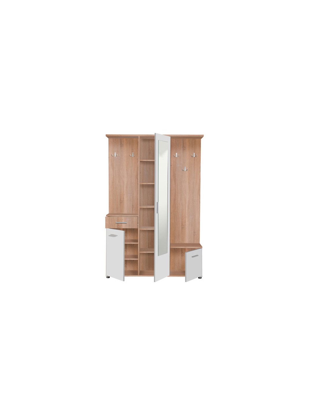 Predsoblje MARTIN, u kombinaciji bijele boje i sonoma hrasta, učinit će prvi susret s vašim domom učinkovitim i ugodnim. Ovaj model ima uredno organiziran prostor za pohranu sezonske garderobe i obuće, tako ćete postići funkcionalno organiziran prostor, dok središnje postavljeno ogledalo daje osjećaj prostranosti.