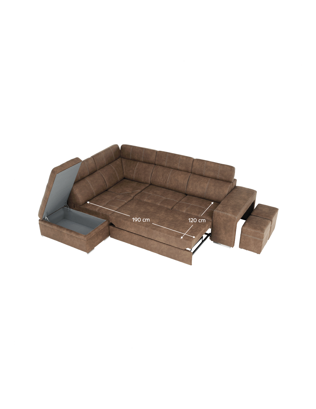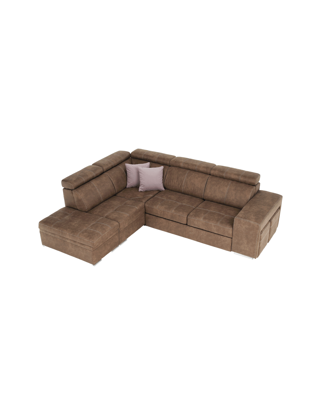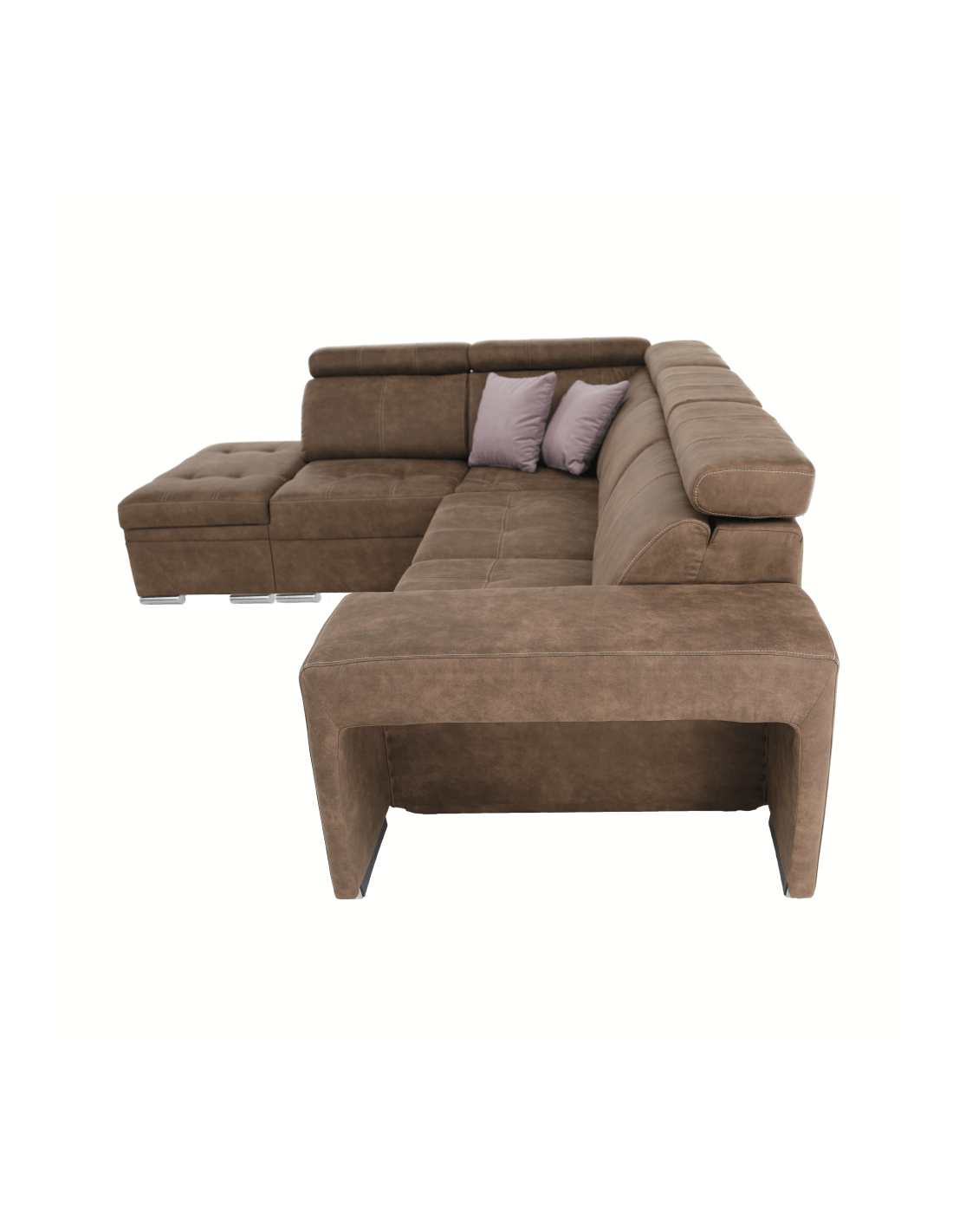 Tražite li novu garnituru za sjedenje, ali se ne možete odlučiti? Danas na tržištu postoji veliki broj garnitura za sjedenje, ali imate dilemu, koja je prava za vas? Imamo originalan savjet za vas u obliku potpuno tapecirane kutne garniture LANZA. Osim što je moderna i idealno se uklapa u vaš interijer, nudi i nenametljiv dizajn s mnogim funkcijama. Prostor za pohranu pronaći ćete u bočnom otomanu. Lanza je opremljena pozicionirajućim uzglavljem, koje osigurava udoban oslonac za leđa i glavu. U slučaju neočekivanog posjeta, kauč možete rasklopiti u povremeni ležaj i tako dobiti prostor za spavanje dimenzija 120x190 cm. Kauč također ima dva taburea, koji se nalaze u naslonu za ruke. Izrađen od visokokvalitetne tkanine s efektom brušene kože Preston u smeđoj boji. Tkanina Jasmine u svijetlo ljubičastoj boji prekrasno se ističe na dva ukrasna jastuka koja dolaze uz kauč. Jezgra sjedala je falista opruga i HR pjena. Počastite se praktičnošću i modernim dizajnom ove originalne garniture za sjedenje.