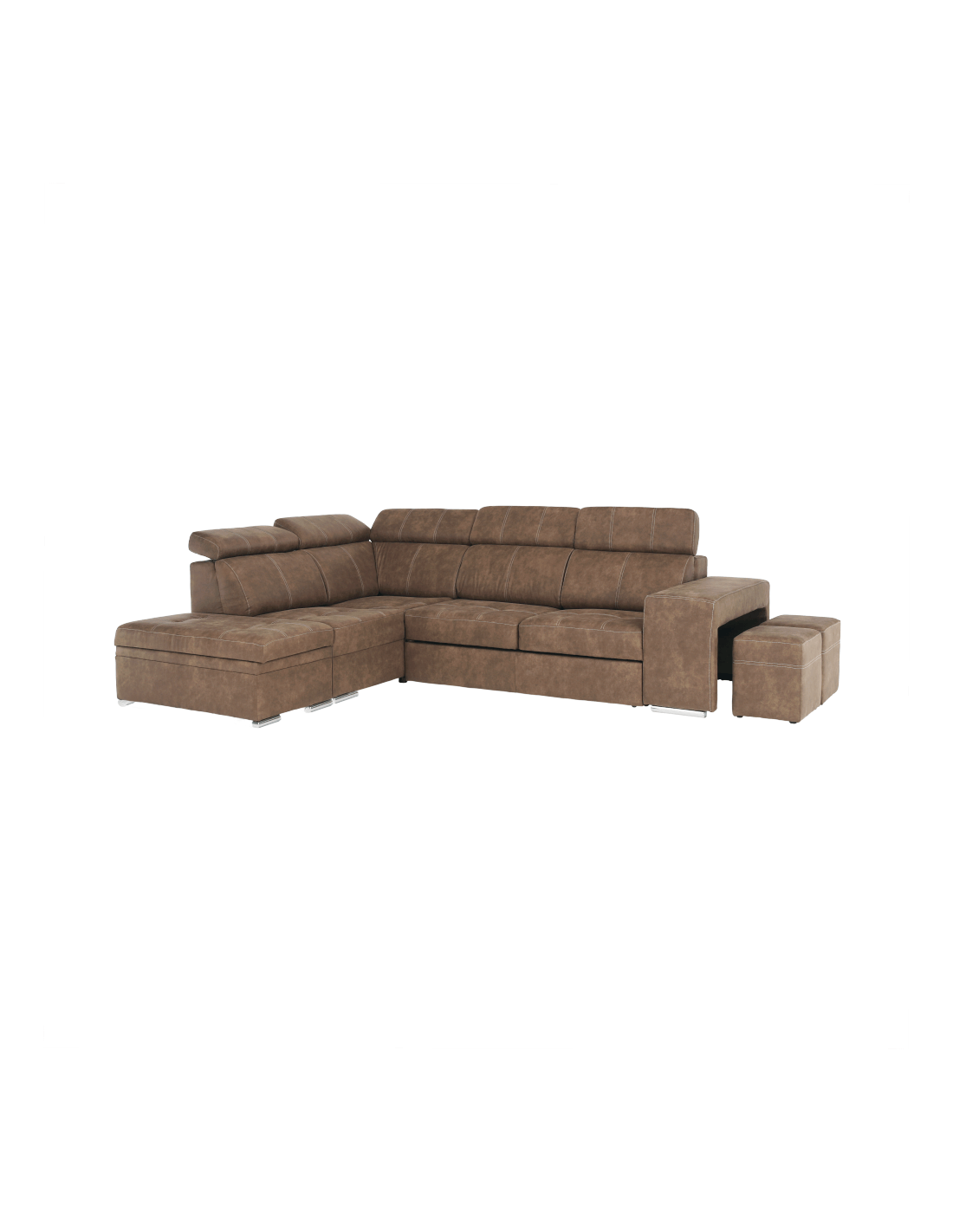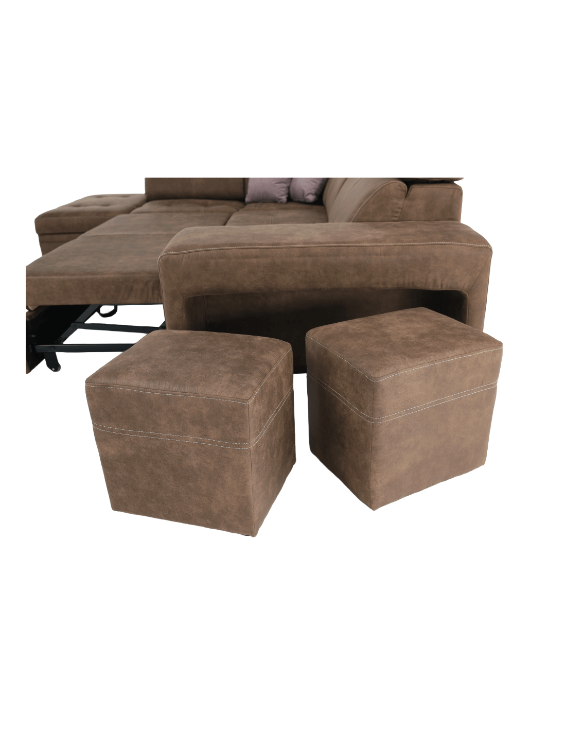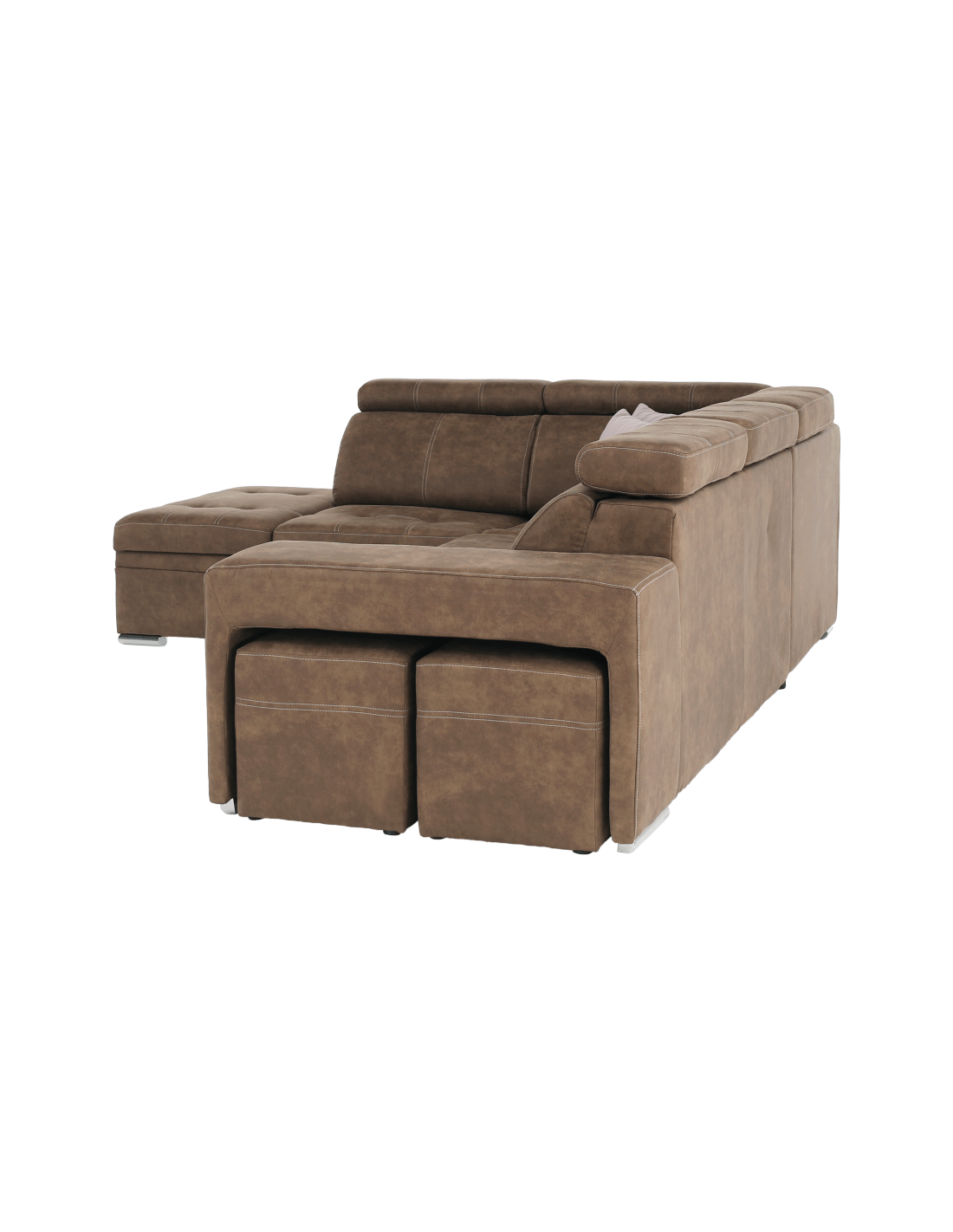 Tražite li novu garnituru za sjedenje, ali se ne možete odlučiti? Danas na tržištu postoji veliki broj garnitura za sjedenje, ali imate dilemu, koja je prava za vas? Imamo originalan savjet za vas u obliku potpuno tapecirane kutne garniture LANZA. Osim što je moderna i idealno se uklapa u vaš interijer, nudi i nenametljiv dizajn s mnogim funkcijama. Prostor za pohranu pronaći ćete u bočnom otomanu. Lanza je opremljena pozicionirajućim uzglavljem, koje osigurava udoban oslonac za leđa i glavu. U slučaju neočekivanog posjeta, kauč možete rasklopiti u povremeni ležaj i tako dobiti prostor za spavanje dimenzija 120x190 cm. Kauč također ima dva taburea, koji se nalaze u naslonu za ruke. Izrađen od visokokvalitetne tkanine s efektom brušene kože Preston u smeđoj boji. Tkanina Jasmine u svijetlo ljubičastoj boji prekrasno se ističe na dva ukrasna jastuka koja dolaze uz kauč. Jezgra sjedala je falista opruga i HR pjena. Počastite se praktičnošću i modernim dizajnom ove originalne garniture za sjedenje.