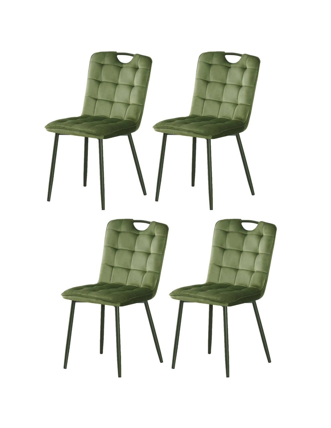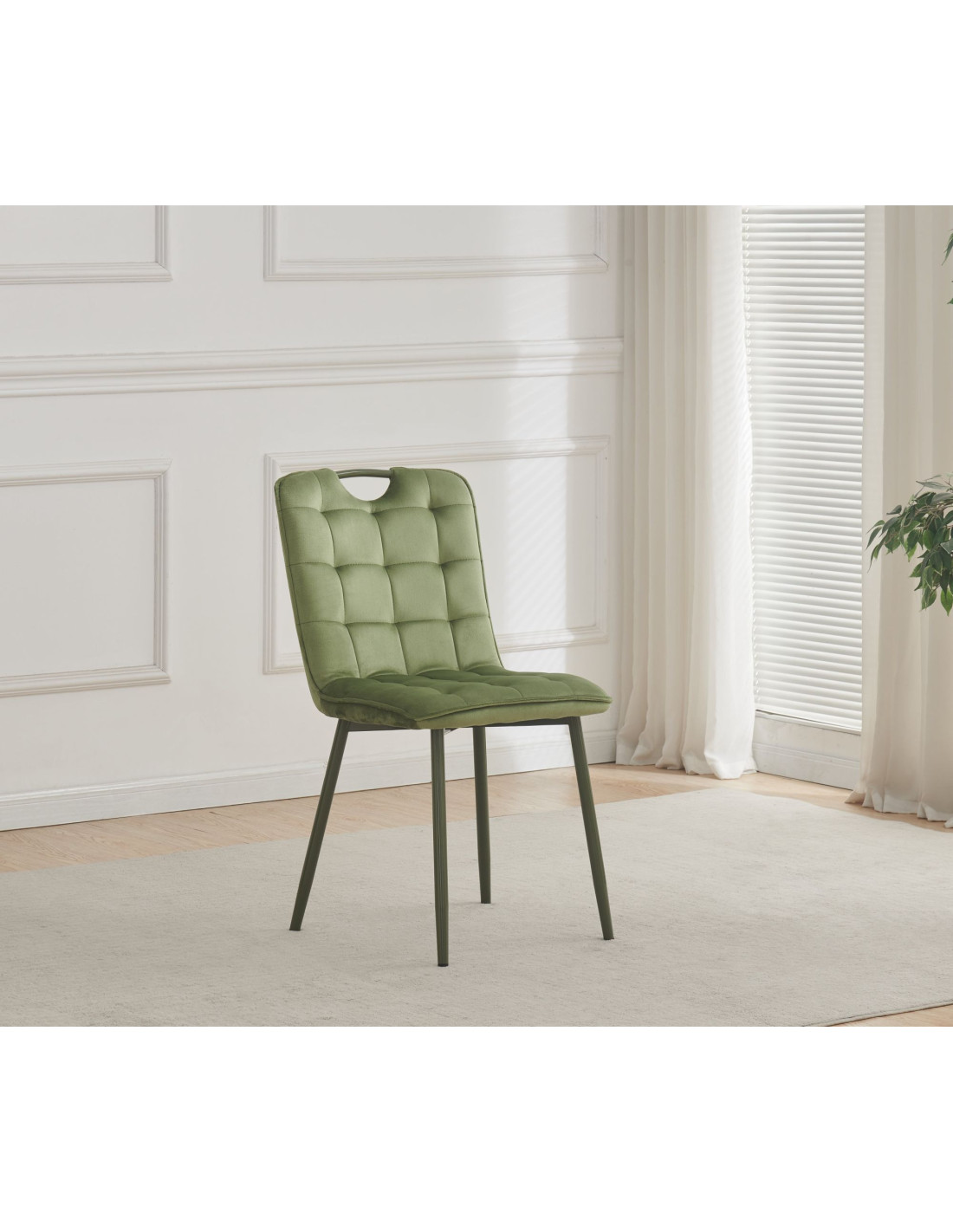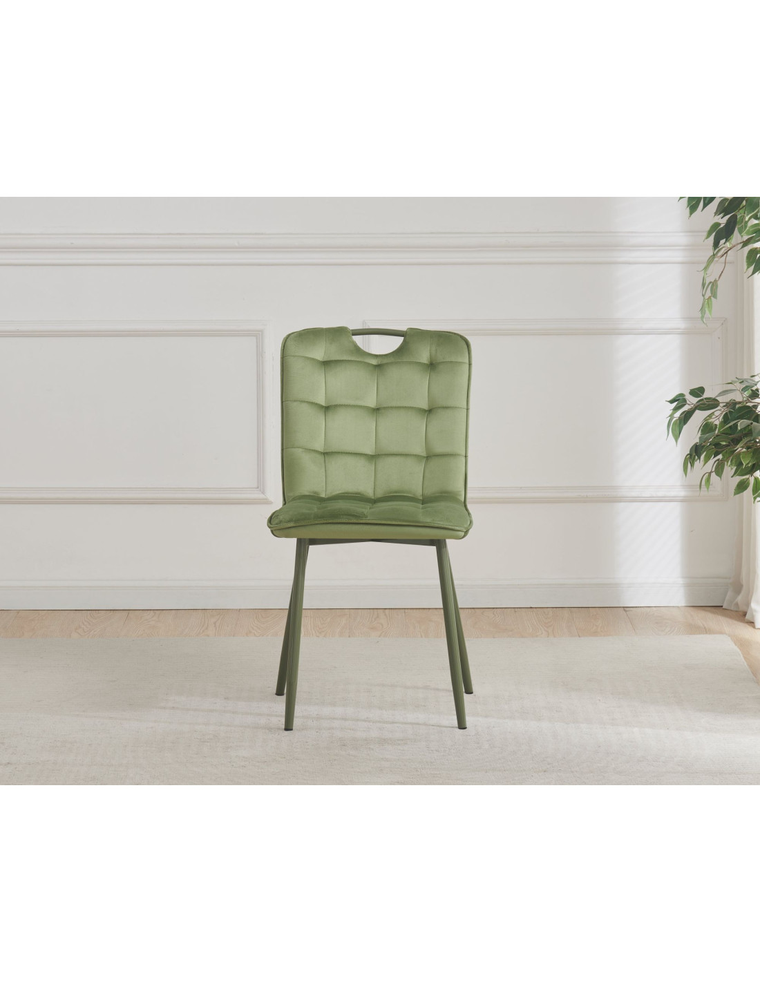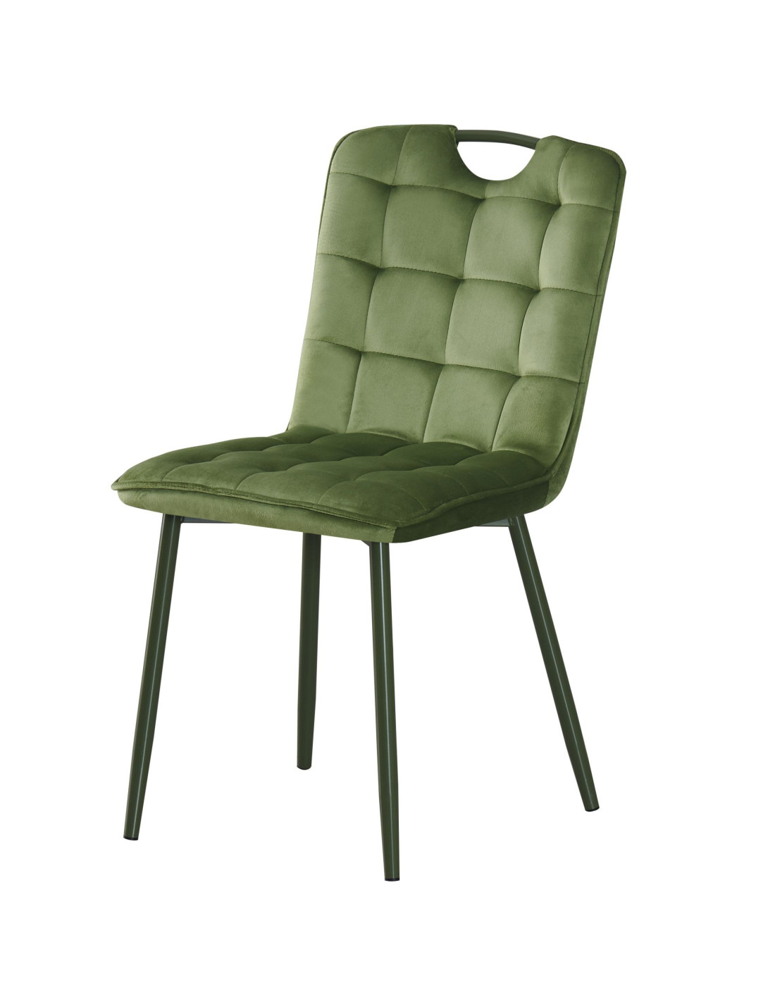 Baršunasta blagovaonska stolica dizajnirana za udobno sjedenje i čist, ujednačen izgled. Dostupna u crnoj ili zelenoj boji, stolica je dizajnirana kako bi se uklopila u razne sheme boja interijera. Bašutasta presvlaka prošivena je ukrasnim kvadratnim šavovima preko sjedala i naslona. Baza i ručka za nošenje obojene su u istu boju kao i tkanina, stvarajući monokromatski izgled koji stolici daje potpun, moderan karakter. Dubina sjedala je 41 cm, što pruža udobnu potporu za tipičnu upotrebu za blagovaonskim stolom. Ručka je također postavljena na vrhu naslona, što olakšava pomicanje stolice po prostoriji.