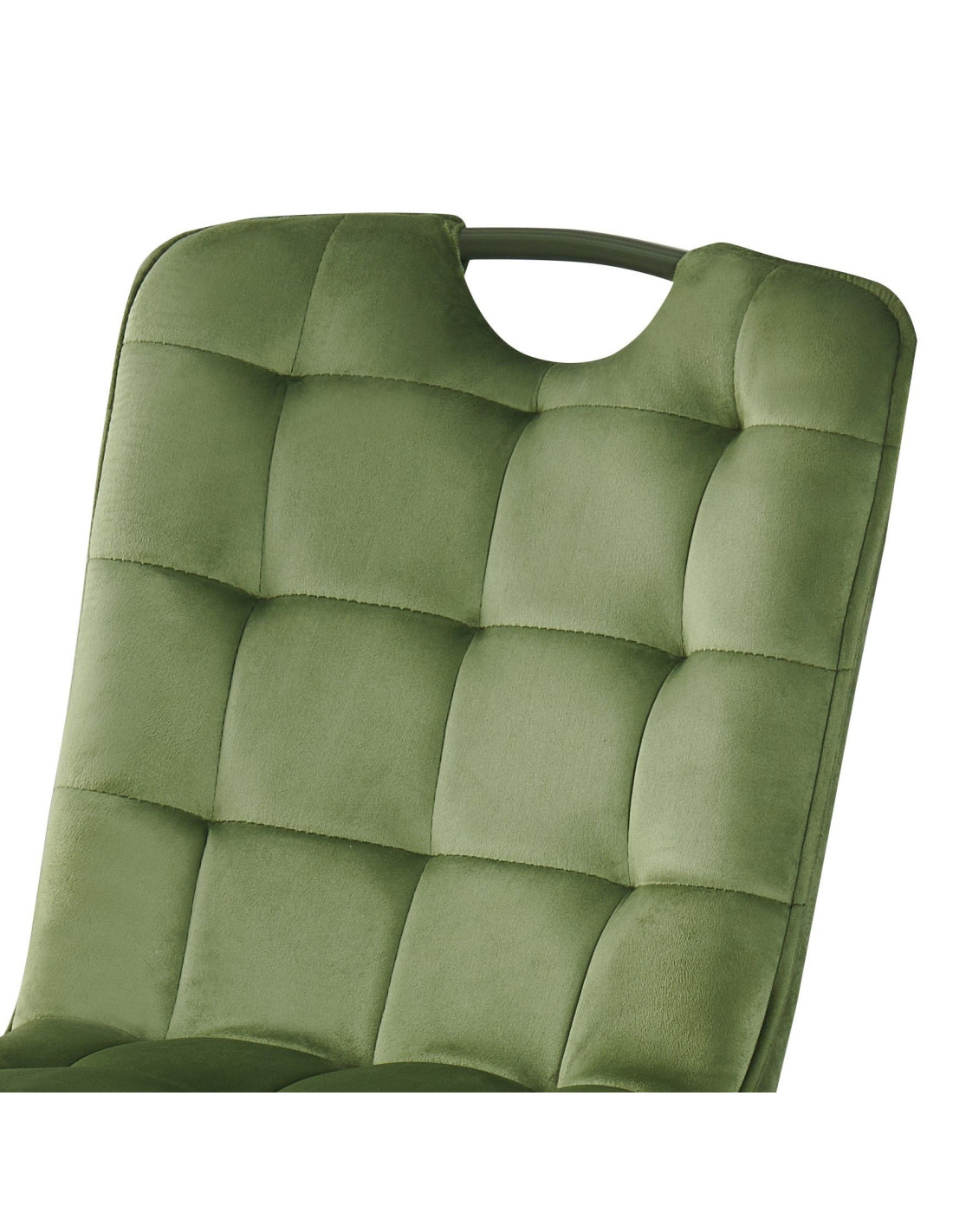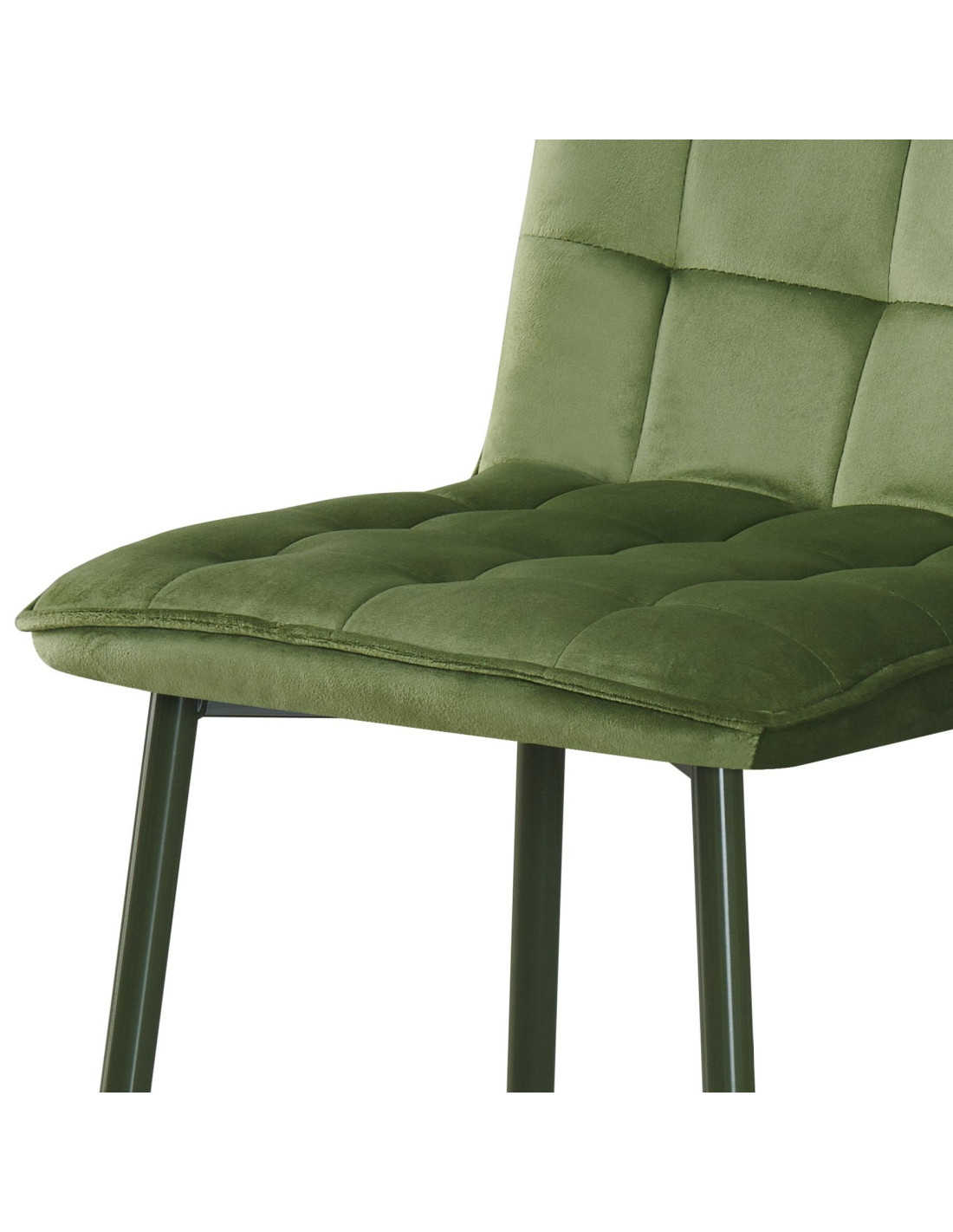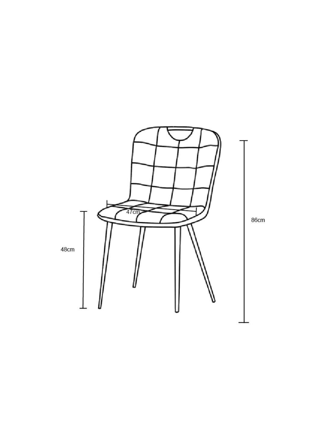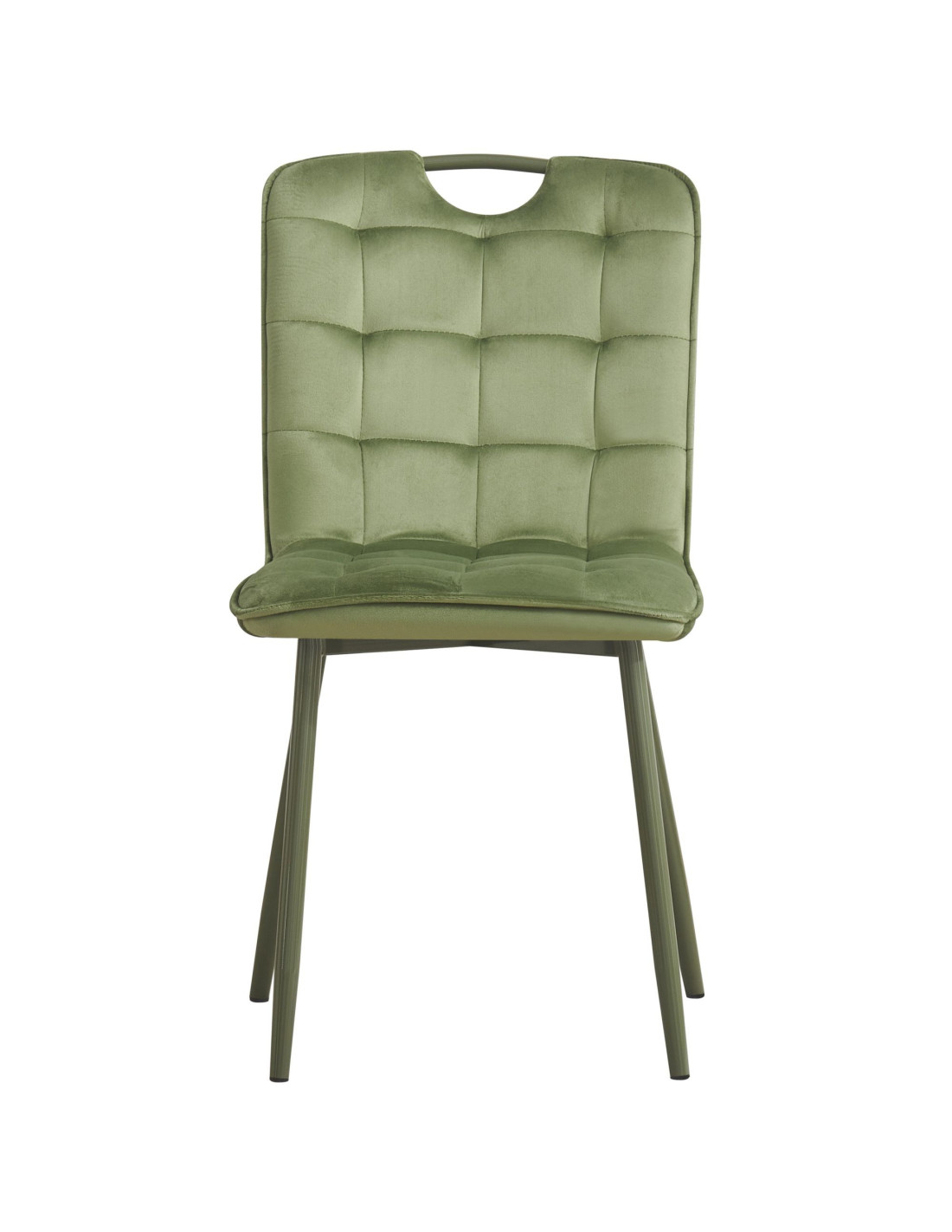 Baršunasta blagovaonska stolica dizajnirana za udobno sjedenje i čist, ujednačen izgled. Dostupna u crnoj ili zelenoj boji, stolica je dizajnirana kako bi se uklopila u razne sheme boja interijera. Bašutasta presvlaka prošivena je ukrasnim kvadratnim šavovima preko sjedala i naslona. Baza i ručka za nošenje obojene su u istu boju kao i tkanina, stvarajući monokromatski izgled koji stolici daje potpun, moderan karakter. Dubina sjedala je 41 cm, što pruža udobnu potporu za tipičnu upotrebu za blagovaonskim stolom. Ručka je također postavljena na vrhu naslona, što olakšava pomicanje stolice po prostoriji.