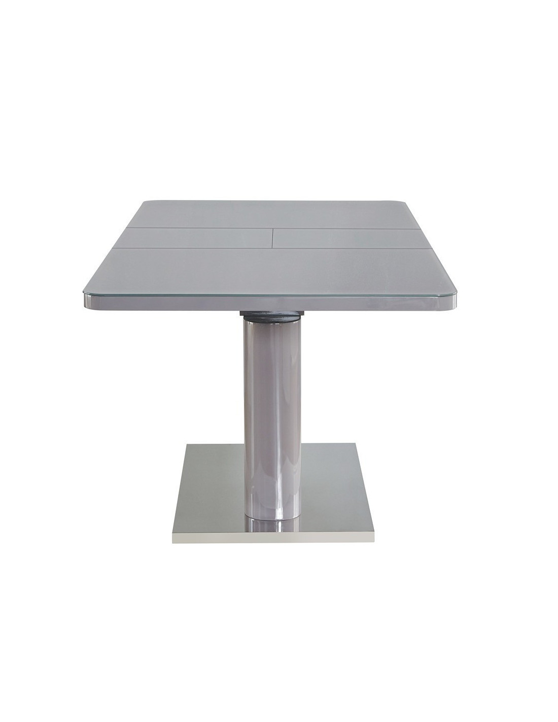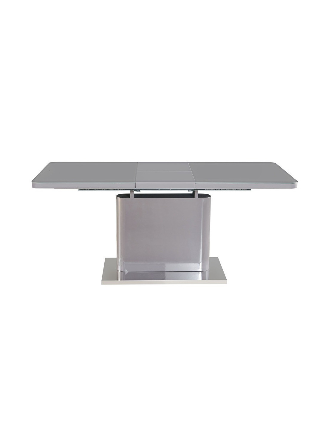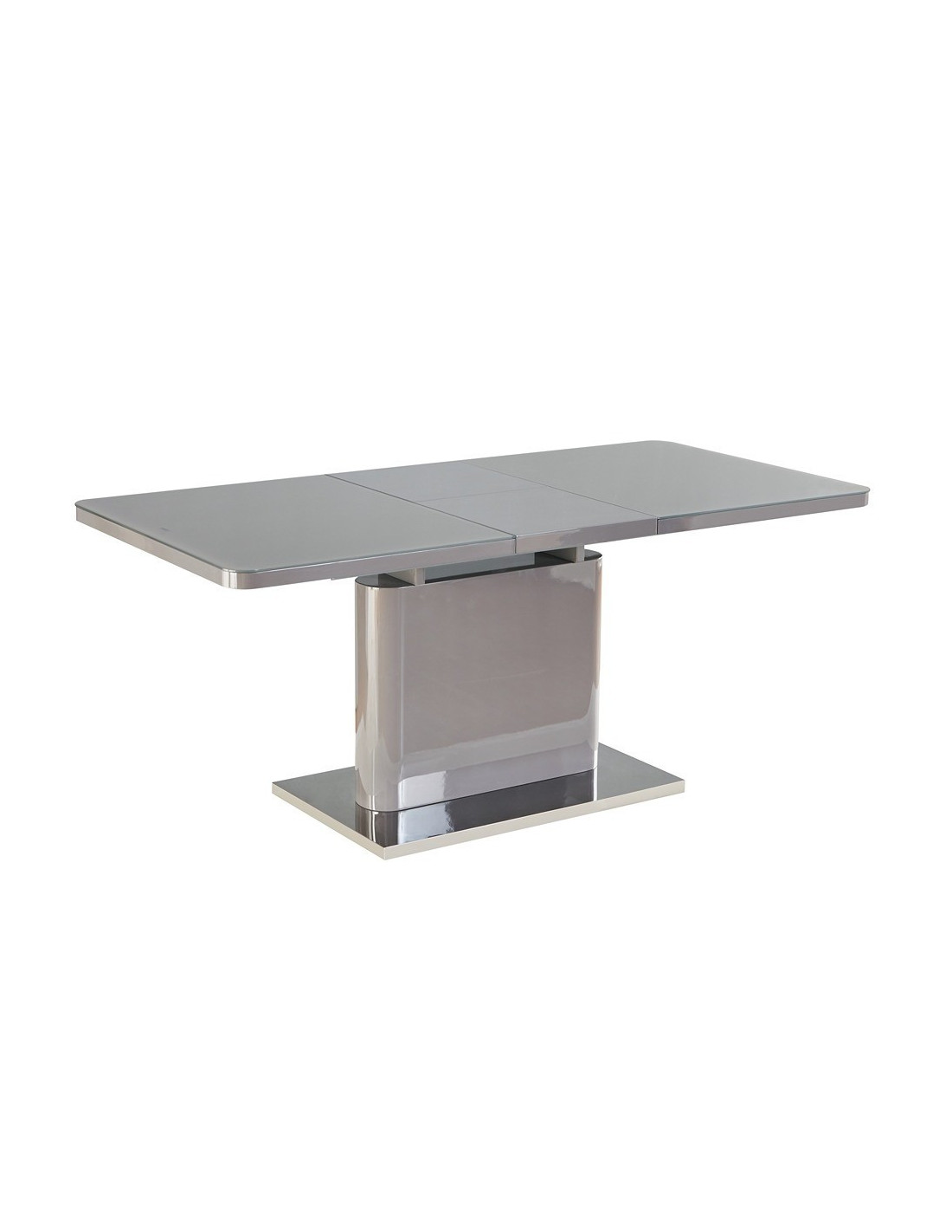 Prostran stol na razvlačenje, dostupan u sivoj boji visokog sjaja. Ploča stola je izrađena od MDF materijala, sa staklenim gornjim slojem. Sa jednostavnim leptir mehanizmom i produžetkom u sredini, panel se rasteže od 140x90cm do dužine 180x90cm. Središnji stup je iste boje kao i ploča stola. Podna ploča izrađena od nehrđajućeg čelika poliranog do zrcalnog izgleda osigurava dobru stabilnost. Maksimalna nosivost stola je 70 kg na središnjoj ploči i po 20 kg na obje bočne ploče, ukupno 110 kg.