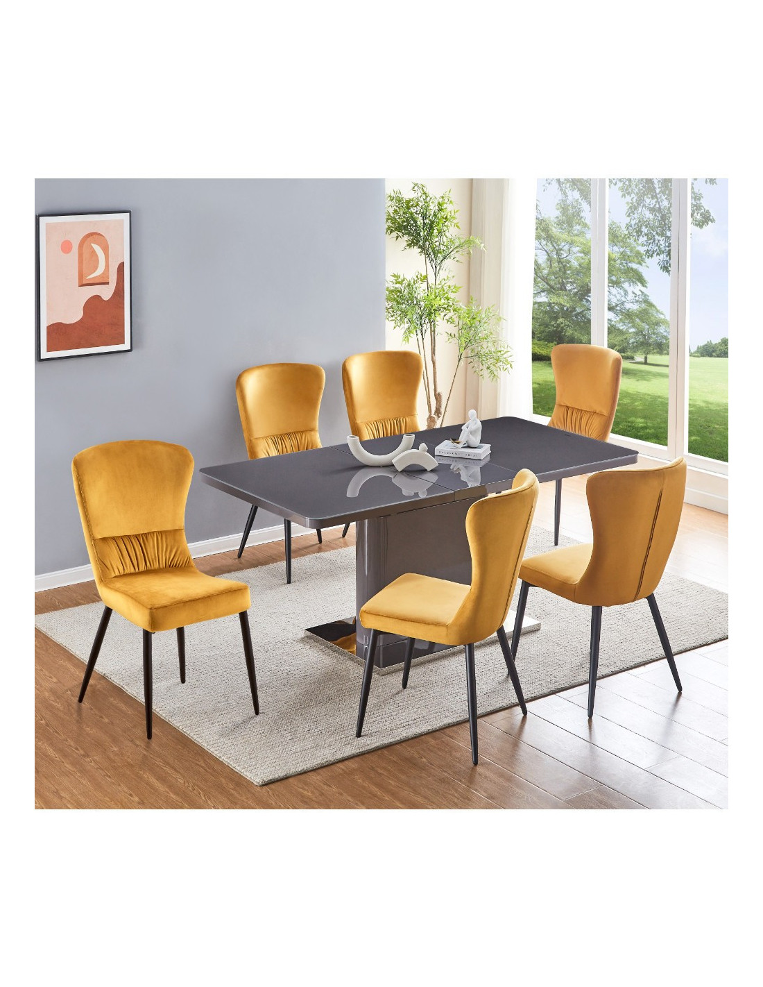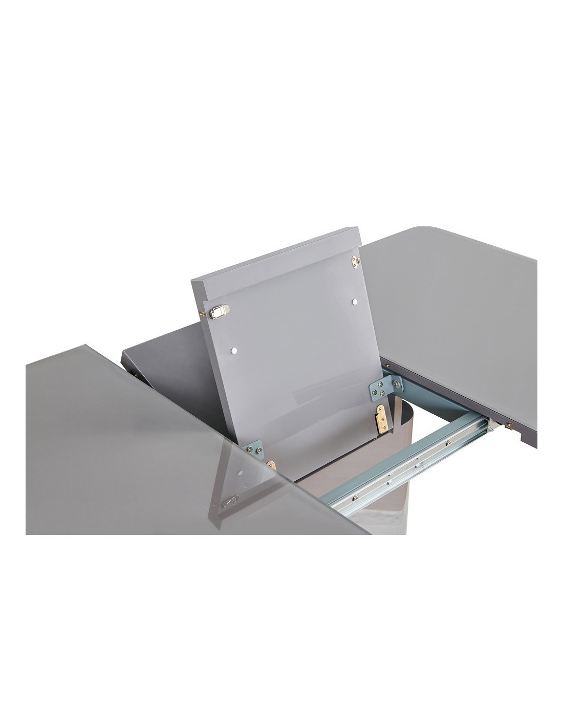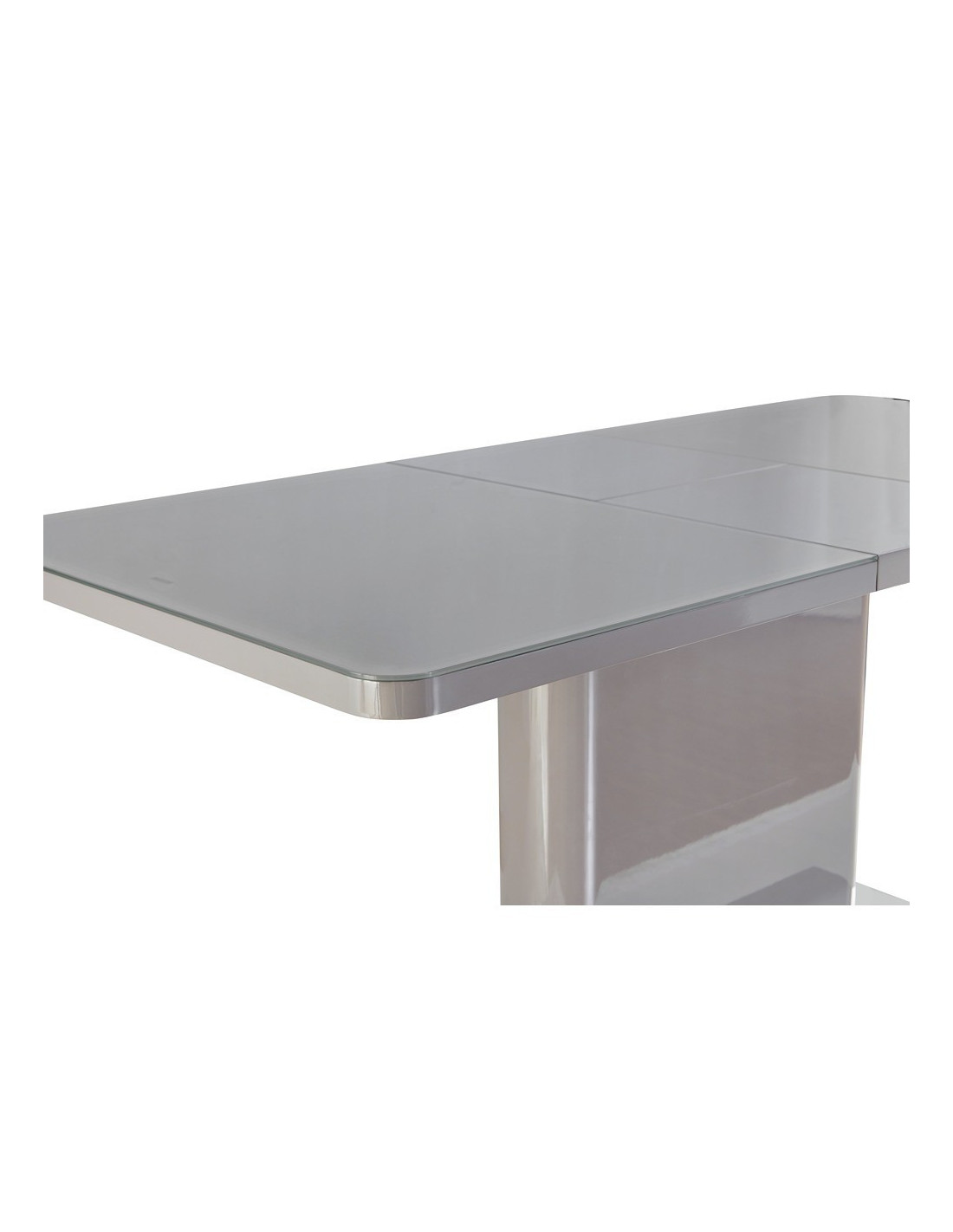 Prostran stol na razvlačenje, dostupan u sivoj boji visokog sjaja. Ploča stola je izrađena od MDF materijala, sa staklenim gornjim slojem. Sa jednostavnim leptir mehanizmom i produžetkom u sredini, panel se rasteže od 140x90cm do dužine 180x90cm. Središnji stup je iste boje kao i ploča stola. Podna ploča izrađena od nehrđajućeg čelika poliranog do zrcalnog izgleda osigurava dobru stabilnost. Maksimalna nosivost stola je 70 kg na središnjoj ploči i po 20 kg na obje bočne ploče, ukupno 110 kg.