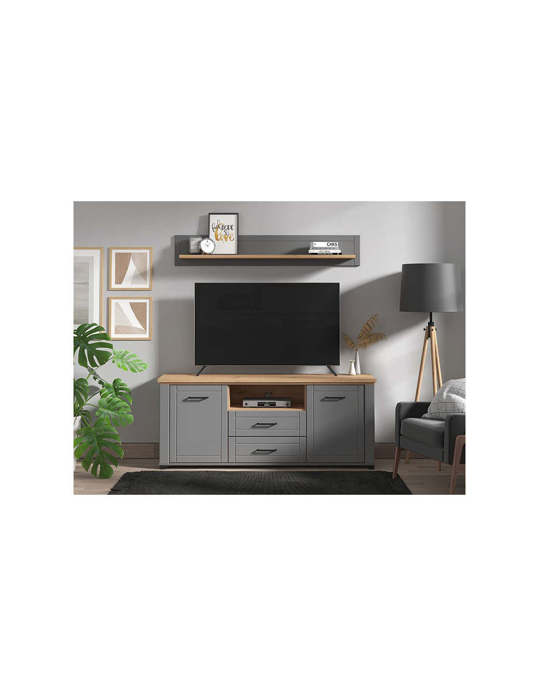 TV polica VALENCIA TV 160 3K2F u kombinaciji s dekorom zanatskog hrasta, grafitno sive i sive mat folije u prostor unosi suptilniju, monokromatsku notu. Korištenje prostora sastoji se od praktičnih ladica u srednjem dijelu, jednog otvorenog i dva zatvorena dijela, koji imaju praktički uređene police za odlaganje. Fronte su obogaćene jednostavnim dizajnerskim crnim ručkama, koje su usklađene s dizajnerskom linijom cijele kolekcije.