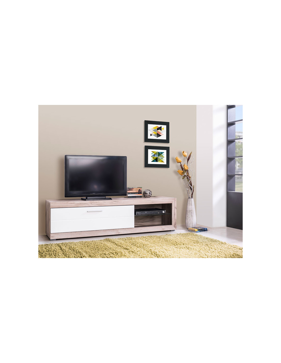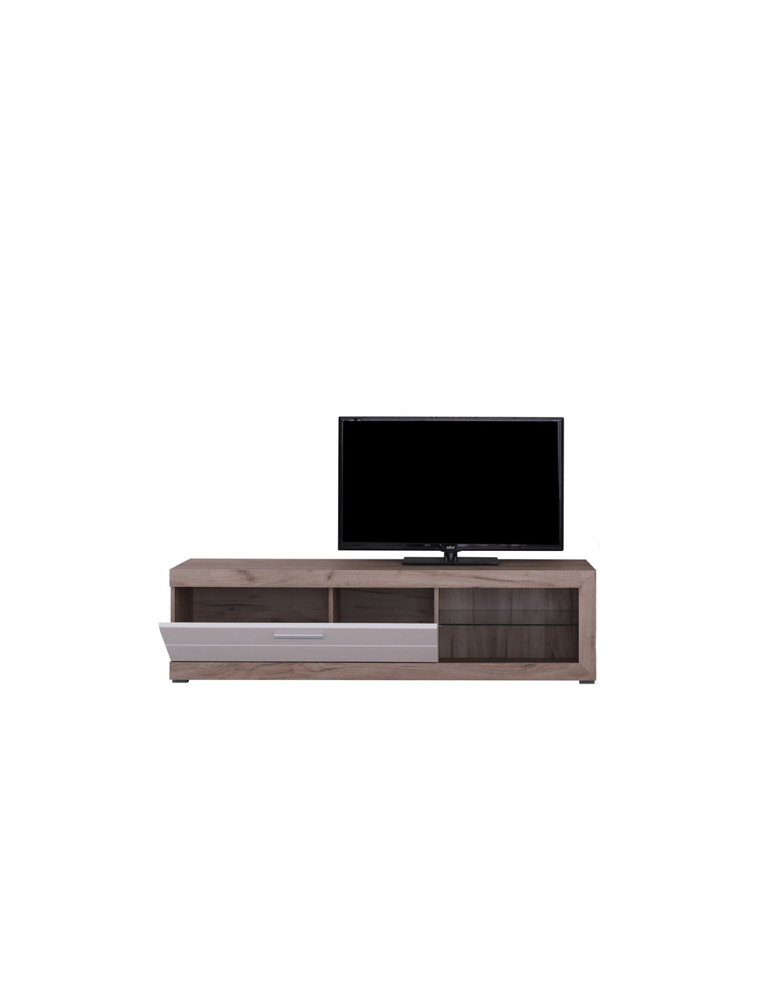 TV polica REMO, u sivom hrastovom dezenu sa bijelom lak folijom, kombinacijom otvorenog i zatvorenog segmenta sa pregradnim dijelom, prati praktične interijerske inovacije koje će se idealno integrirati u ambijent vašeg dnevnog boravka.