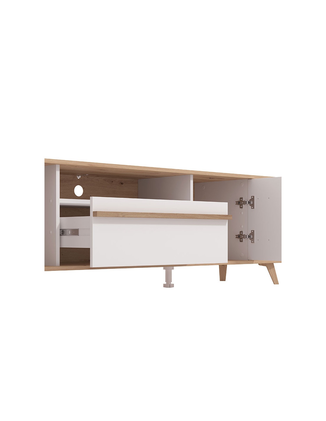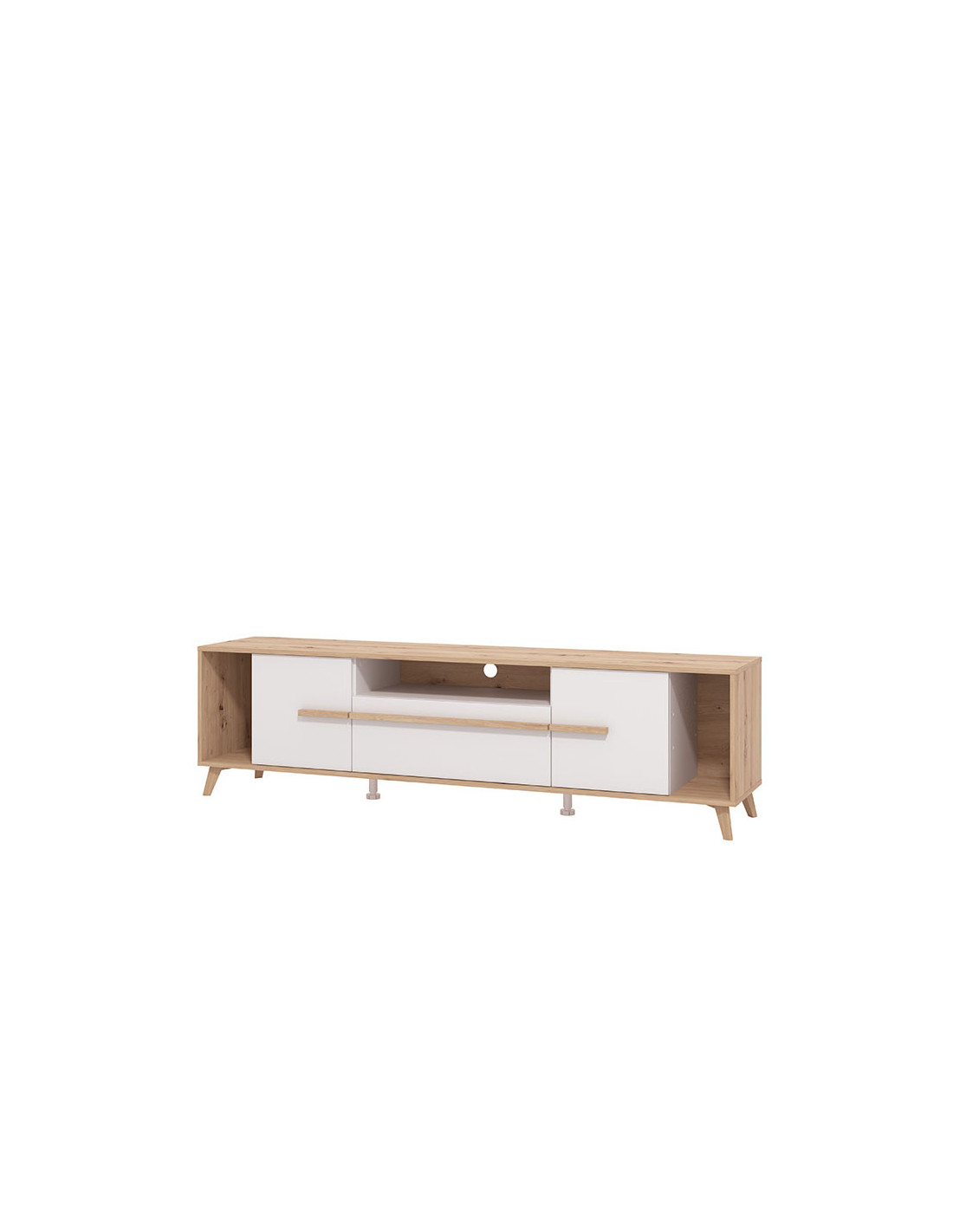 TV polica ORLEANS je sjajan funkcionalni dodatak za uređenje ambijenta dnevnog boravka. Kombinacija bijelog dekora, artisan hrasta i artisan hrastove folije, unosi osvježavajuću estetiku u ambijent. Dva zatvorena segmenta, praktična ladica, kao i otvoreni segmenti, efektno doprinose funkcionalnoj organizaciji TV kutka. Postoji mogućnost dodavanja rasvjete.
