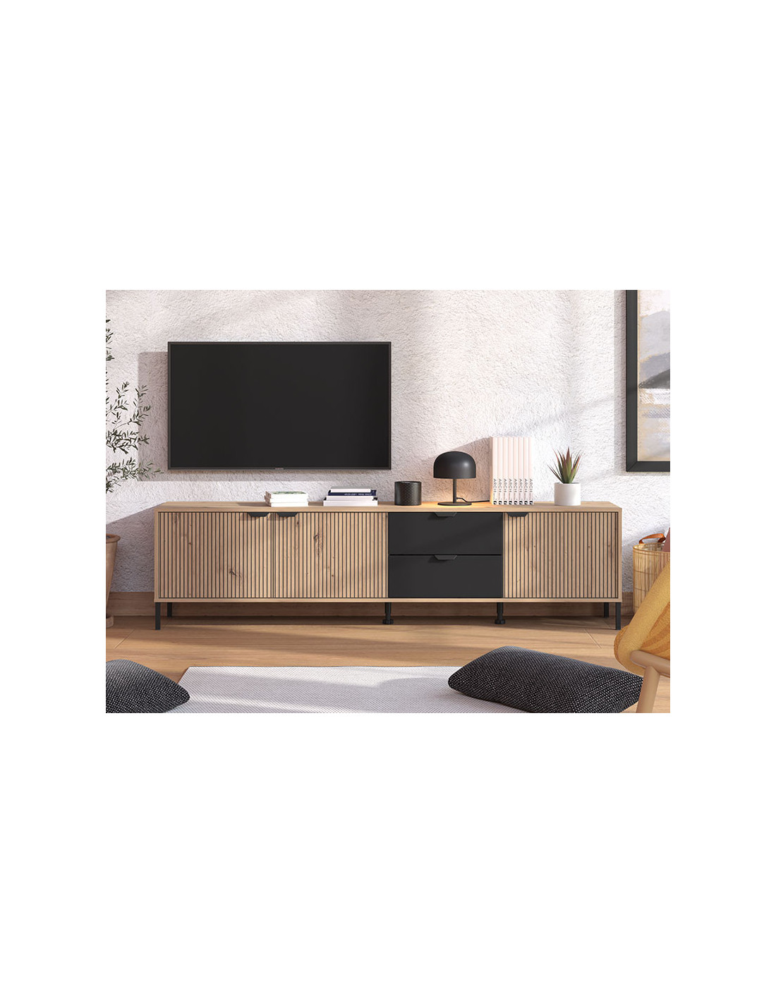 TV polica MAYENNE TV 208 4K3F3V, u kombinaciji dekora artisan hrasta i crne mat folije, dio je iste kolekcije koja će doprinijeti opremanju vašeg doma prema najnovijim standardima uređenja interijera. TV polica MAYENNE TV 208 4K2F3V ima tri zatvorena segmenta s pregradama i dvije ladice.