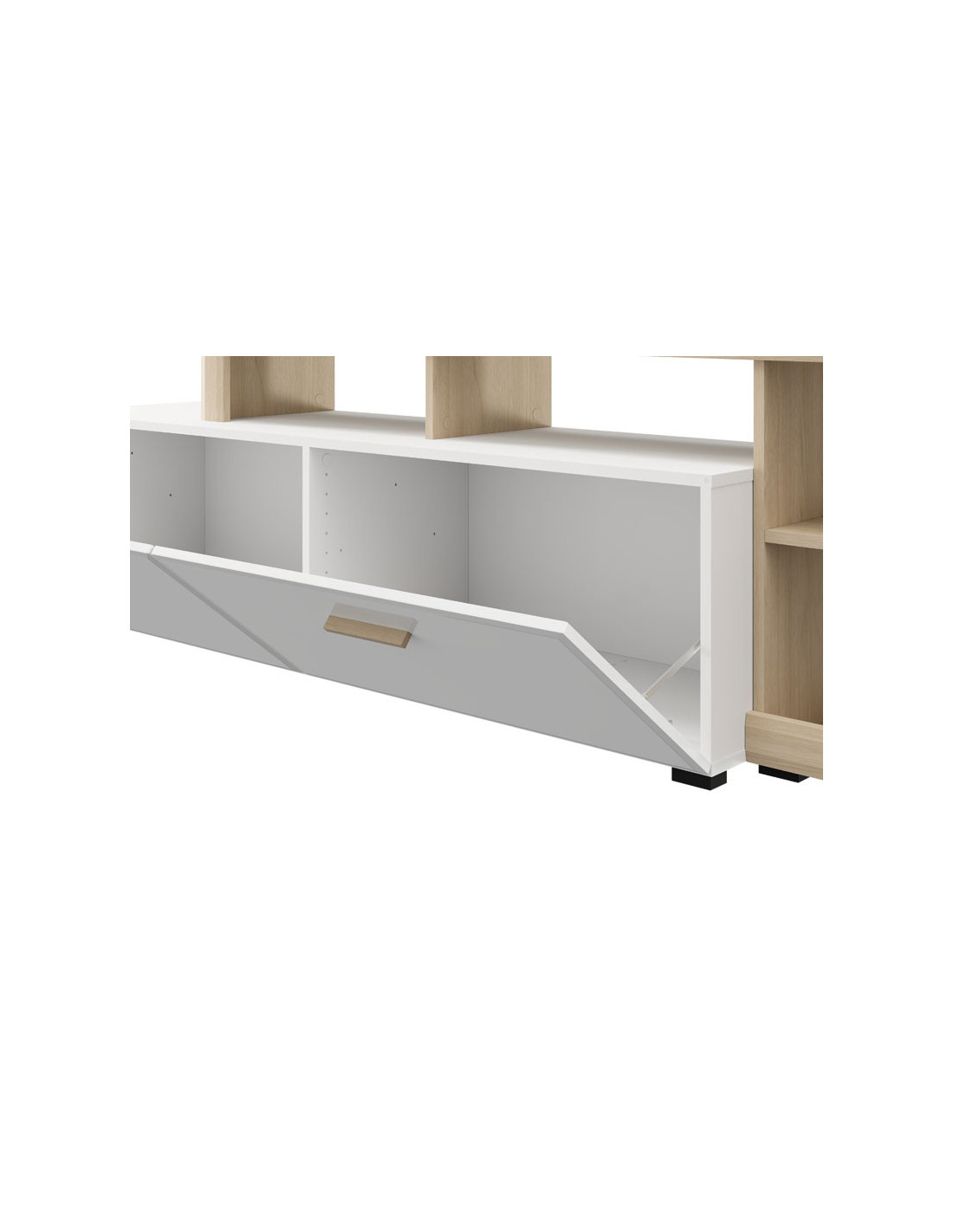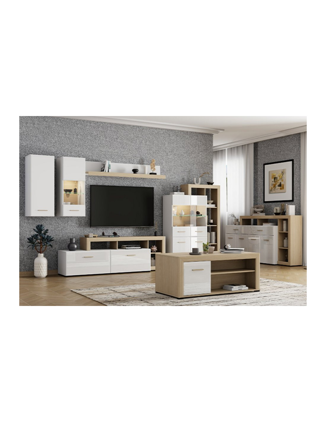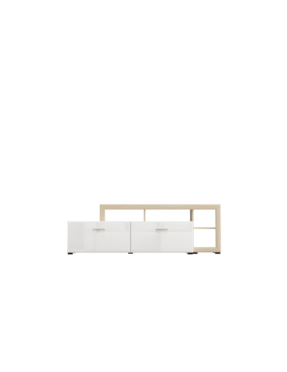 TV polica CARLOW TV 189 2K2V funkcionalan je i estetski upečatljiv element za opremanje dnevnog boravka. Kombinacija neprozirno bijelog dekora, svijetlog port hrasta, bijele lak folije i svijetle port hrast folije unosi osjećaj topline i vizualne ravnoteže u prostor, čineći ovaj element lakim za uklapanje u različite koncepte interijera. Dvije zatvorene pregrade i atraktivno postavljene otvorene police omogućuju praktičnu organizaciju multimedijskih uređaja i dekorativnih detalja, a istovremeno postiže skladan i jasan izgled.