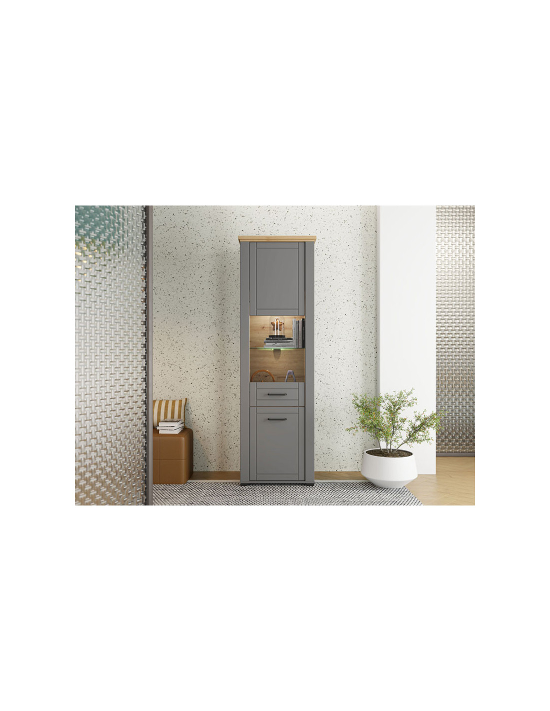 Valencia 1K VS1 vitrina, u kombinaciji s grafitnom sivom i sivom mat folijom, ulazi u prostor suptilnijom, monokromatskom notom. Fronte su obogaćene jednostavnim dizajnerskim crnim ručkama, koje su usklađene s dizajnerskom linijom cijele kolekcije.