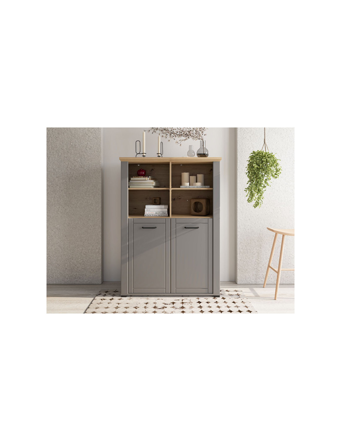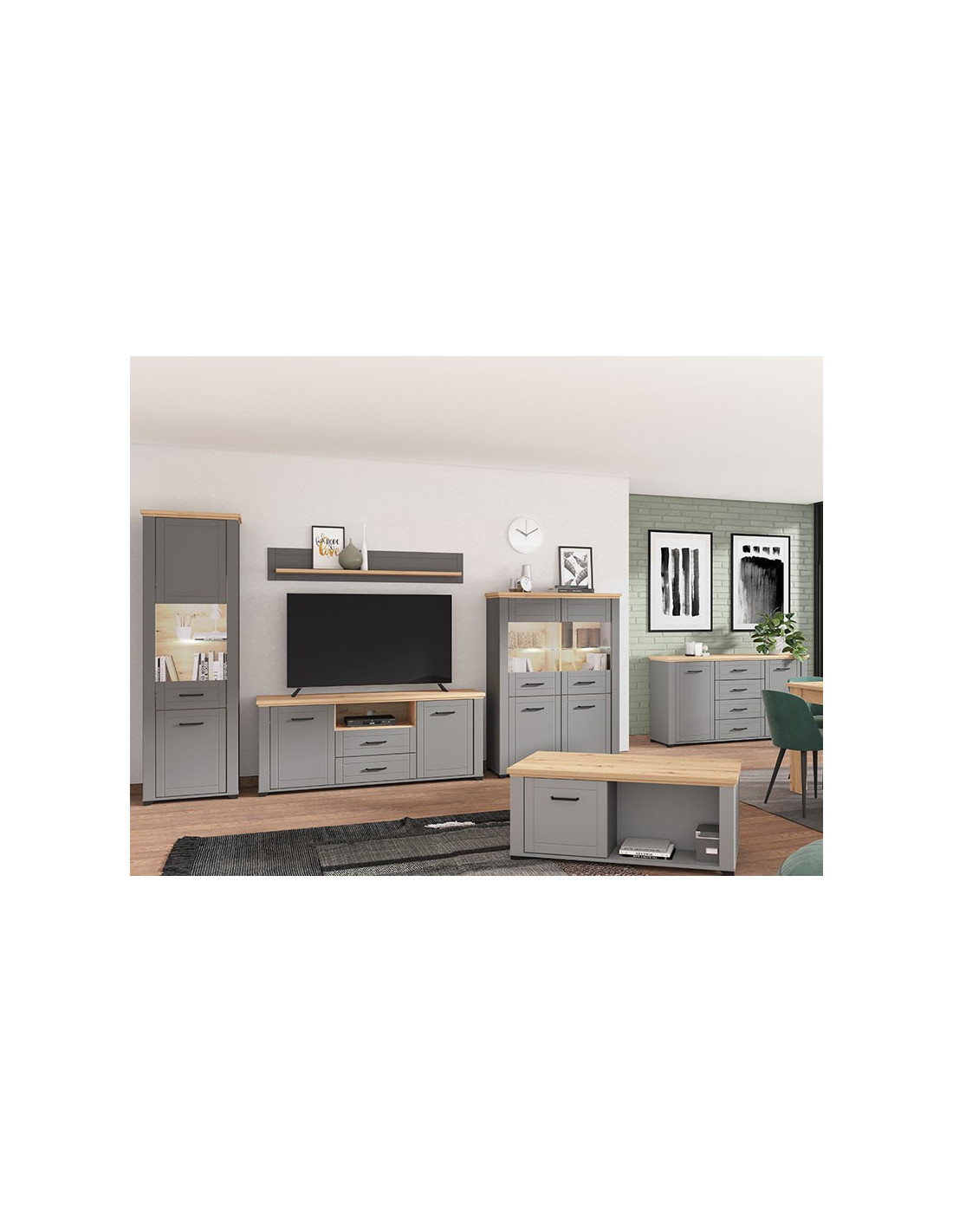 Valencia 2K VS2 vitrina, u kombinaciji s grafitnom sivom i sivom mat folijom, ulazi u prostor suptilnijom, monokromatskom notom. Fronte su obogaćene jednostavnim dizajnerskim crnim ručkama, koje su usklađene s dizajnerskom linijom cijele kolekcije.