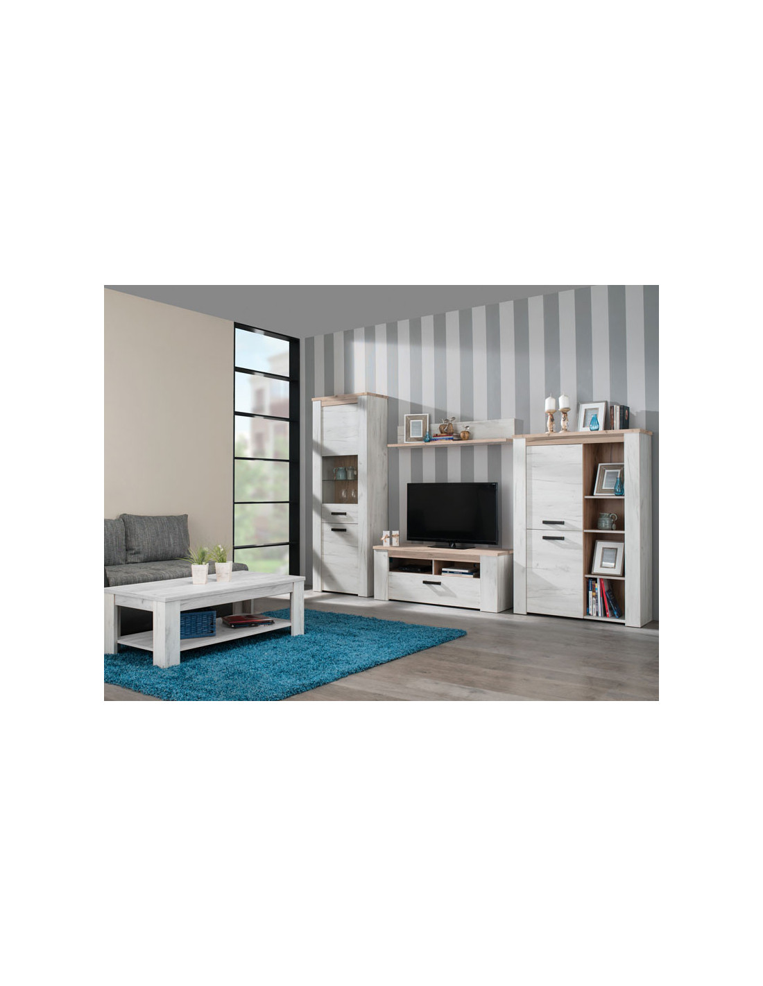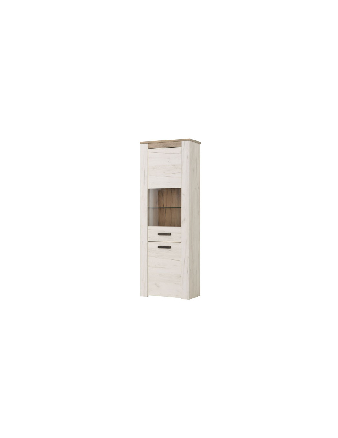 Vitrina KENT VS, u uzorku bijelog i sivog hrasta, sadrži tri standardne i jednu staklenu policu, kao i poluostakljeni dio pogodan za izlaganje omiljenih ukrasa, knjiga i uspomena. Dio je istoimene kolekcije koja donosi dizajnerski iskorak u stvaranju interijerskih rješenja za uređenje dnevnog boravka, spavaće sobe ili hodnika. Ovaj model vitrine možete osvježiti ugradnjom LED rasvjete.