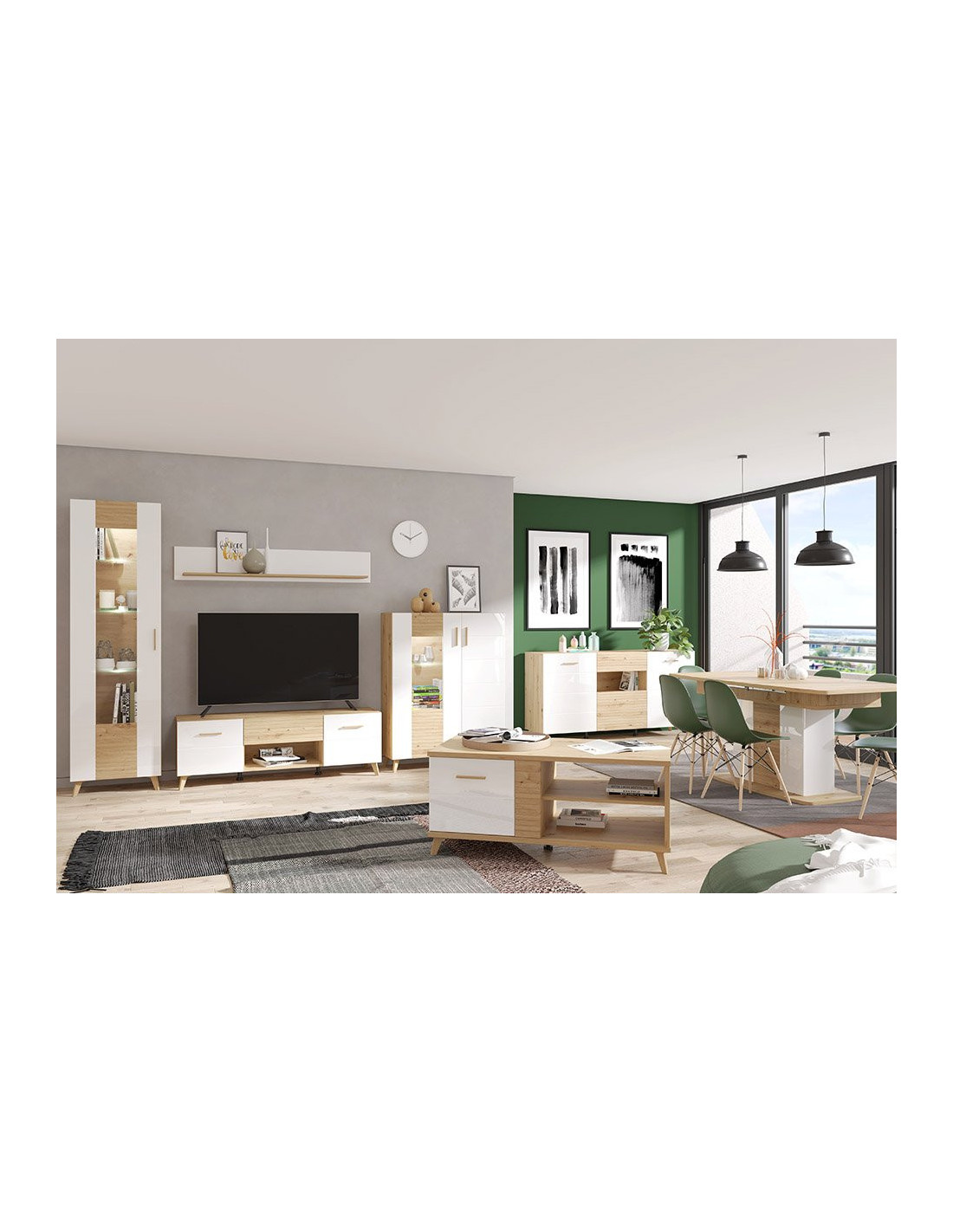 Vitrina BRETAGNA 1K VS1 izrađena je u kombinaciji dekora artisan hrasta sa segmentima u dekoru bijele lak folije, kao i artisan hrast folije, što u okoliš unosi osvježavajuću estetiku. Drvene ručke povezuju dekor u jednu estetsku cjelinu, dok visoke noge naglašavaju njihovu eleganciju. Funkcionalnosti ovog elementa doprinosi praktično uređen iskoristivi prostor. Postoji mogućnost dodavanja rasvjete. Dio je istoimenog sustava elemenata za uređenje ambijenta dnevnog boravka, koji se odlikuju karakteristikama modernog dizajna u kombinaciji s profinjenom notom elegancije.